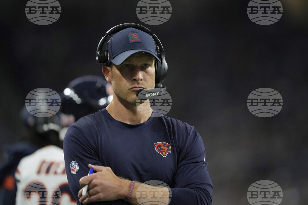 Chicago Bears head coach Ben Johnson watches from the sidelines during the first half of an NFL football game against the Detroit Lions in Detroit, Sunday, Sept. 14, 2025. (AP Photo/Ryan Sun)