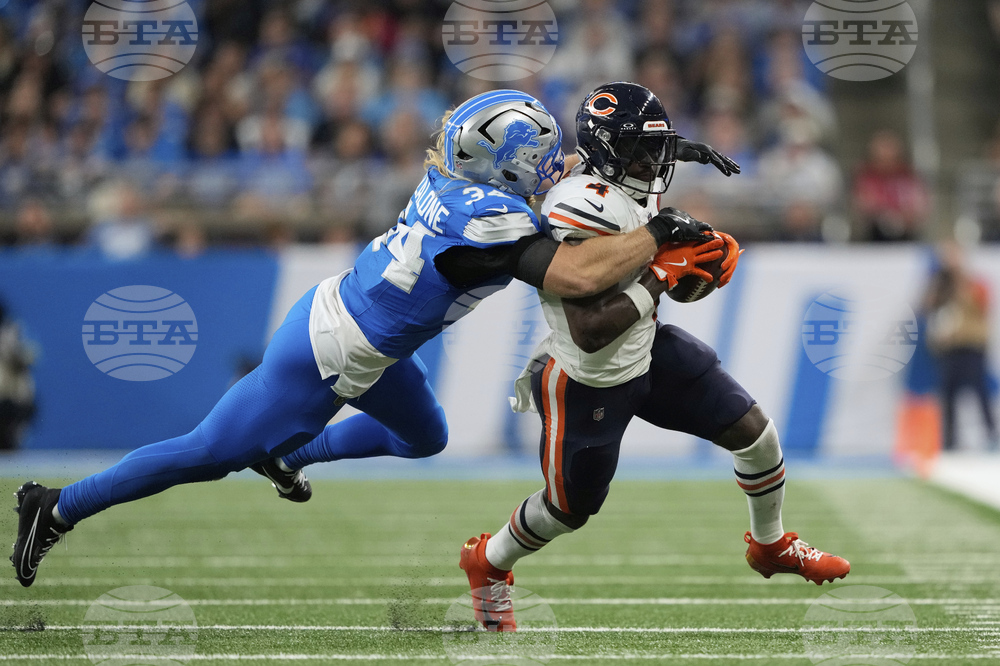 Chicago Bears running back D'Andre Swift (4) is hit by Detroit Lions linebacker Alex Anzalone (34) during the first half of an NFL football game in Detroit, Sunday, Sept. 14, 2025. (AP Photo/Ryan Sun)