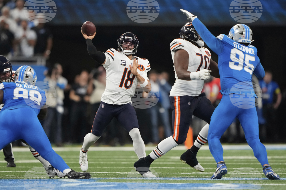 Chicago Bears quarterback Caleb Williams (18) throws against the Detroit Lions during the first half of an NFL football game in Detroit, Sunday, Sept. 14, 2025. (AP Photo/Ryan Sun)