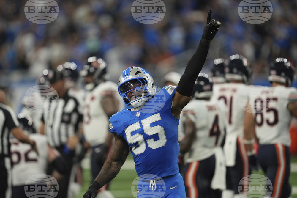 Detroit Lions linebacker Derrick Barnes (55) celebrates a stop against the Chicago Bears during the first half of an NFL football game in Detroit, Sunday, Sept. 14, 2025. (AP Photo/Paul Sancya)