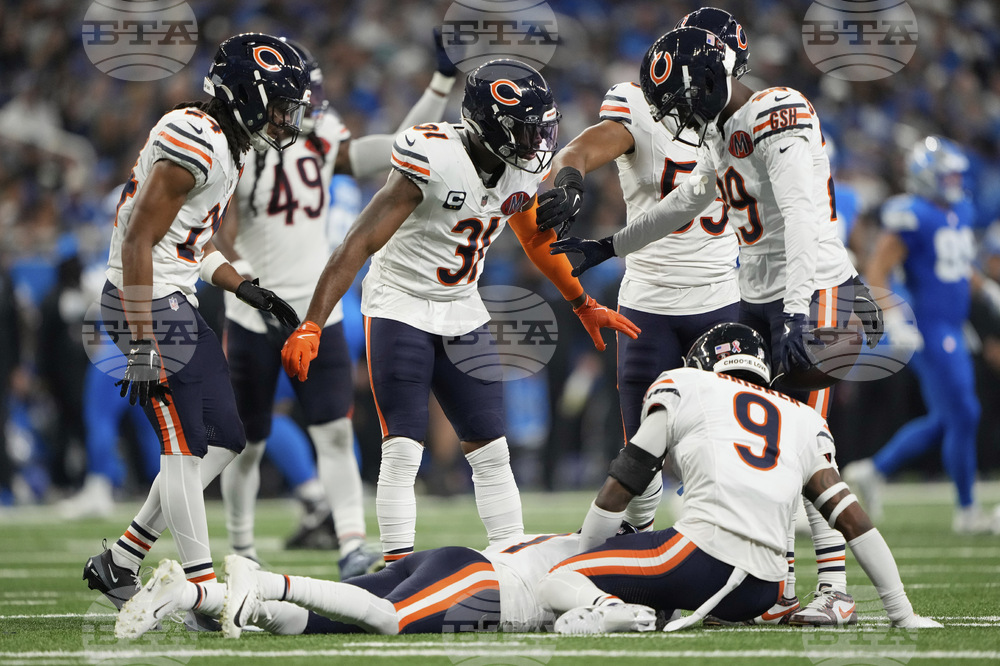 Chicago Bears players check on teammate cornerback Jaylon Johnson (1) after he was injured during the first half of an NFL football game in Detroit, Sunday, Sept. 14, 2025. (AP Photo/Ryan Sun)