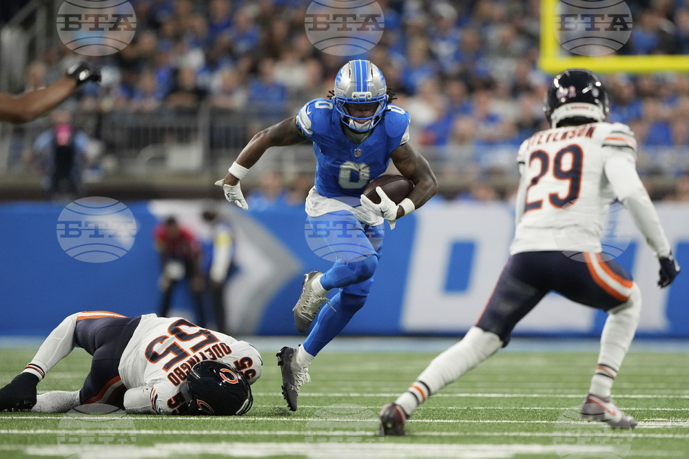Detroit Lions running back Jahmyr Gibbs (0) runs against Chicago Bears defensive end Dayo Odeyingbo (55) and cornerback Tyrique Stevenson (29) during the first half of an NFL football game in Detroit, Sunday, Sept. 14, 2025. (AP Photo/Ryan Sun)