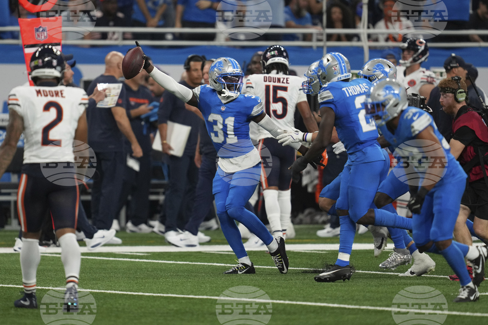 Detroit Lions safety Kerby Joseph (31) celebrates his interception against the Chicago Bears during the first half of an NFL football game in Detroit, Sunday, Sept. 14, 2025. (AP Photo/Ryan Sun)