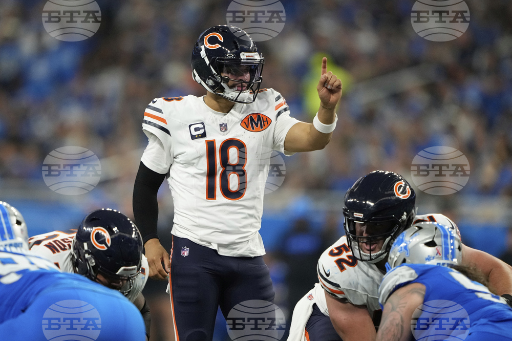 Chicago Bears quarterback Caleb Williams (18) signals during the first half of an NFL football game against the Detroit Lions in Detroit, Sunday, Sept. 14, 2025. (AP Photo/Ryan Sun)