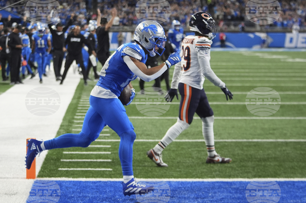Detroit Lions wide receiver Jameson Williams (1) scores a touchdown against the Chicago Bears during the second half of an NFL football game in Detroit, Sunday, Sept. 14, 2025. (AP Photo/Paul Sancya)