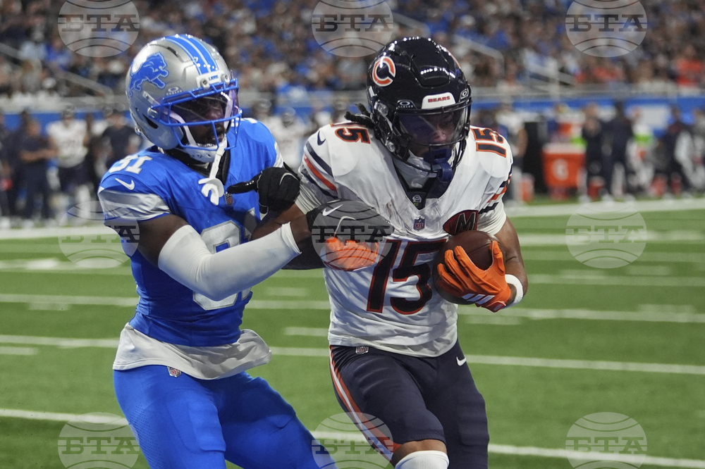 Chicago Bears wide receiver Rome Odunze (15) fumble as he is hit by Detroit Lions safety Brian Branch (32) during the first half of an NFL football game in Detroit, Sunday, Sept. 14, 2025. (AP Photo/=03387207=)