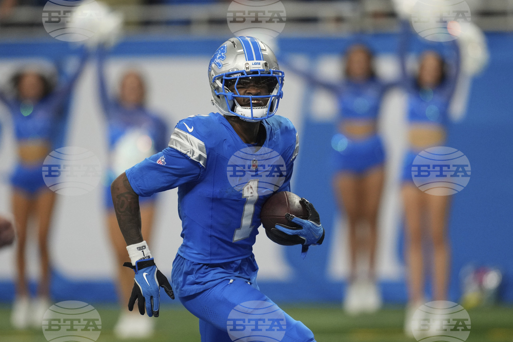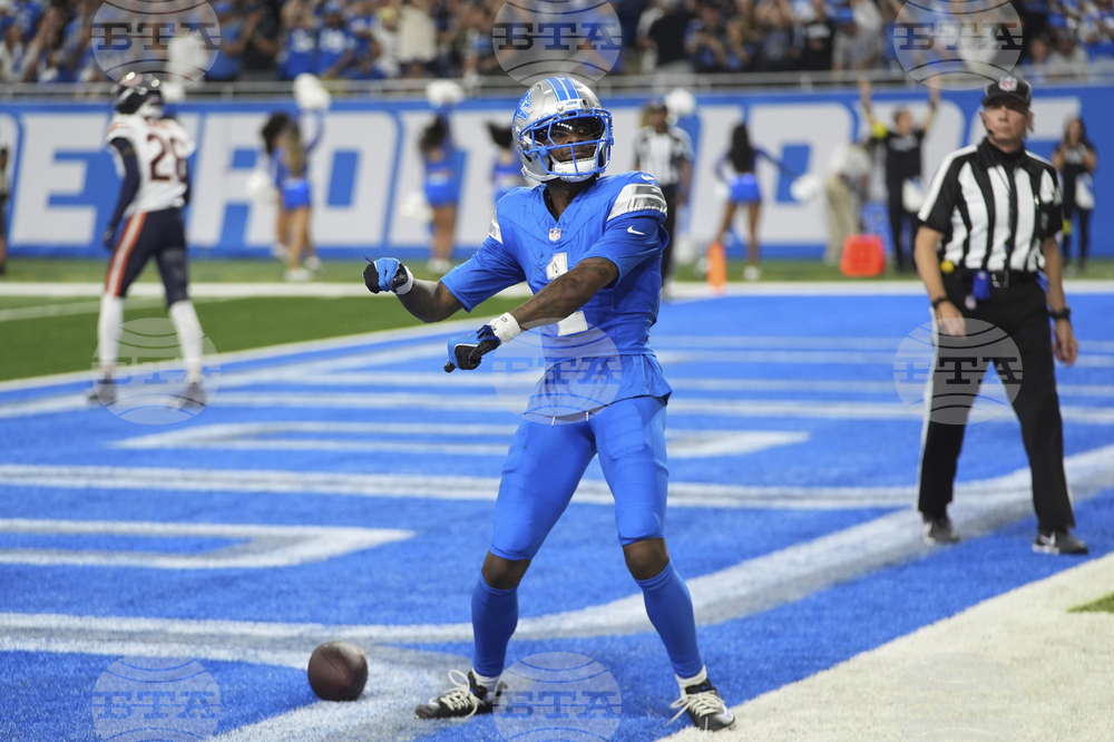 Detroit Lions wide receiver Jameson Williams (1) celebrates after a touchdown against the Chicago Bears during the second half of an NFL football game in Detroit, Sunday, Sept. 14, 2025. (AP Photo/Paul Sancya)