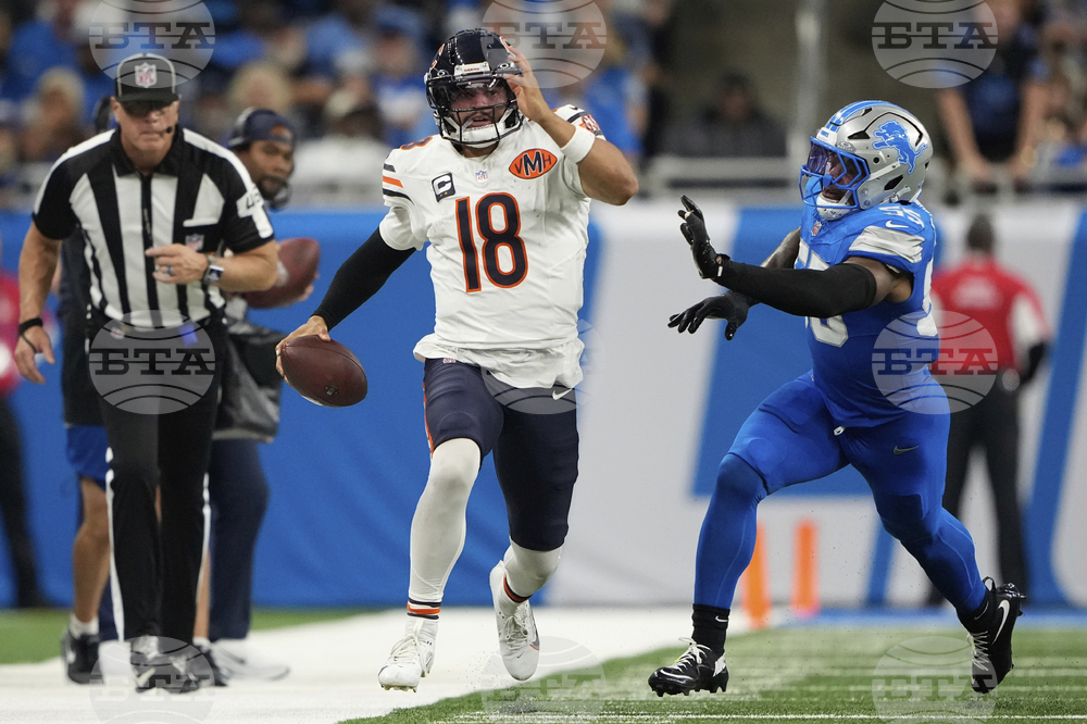 Chicago Bears quarterback Caleb Williams (18) throws against the Detroit Lions during the first half of an NFL football game in Detroit, Sunday, Sept. 14, 2025. (AP Photo/Paul Sancya)