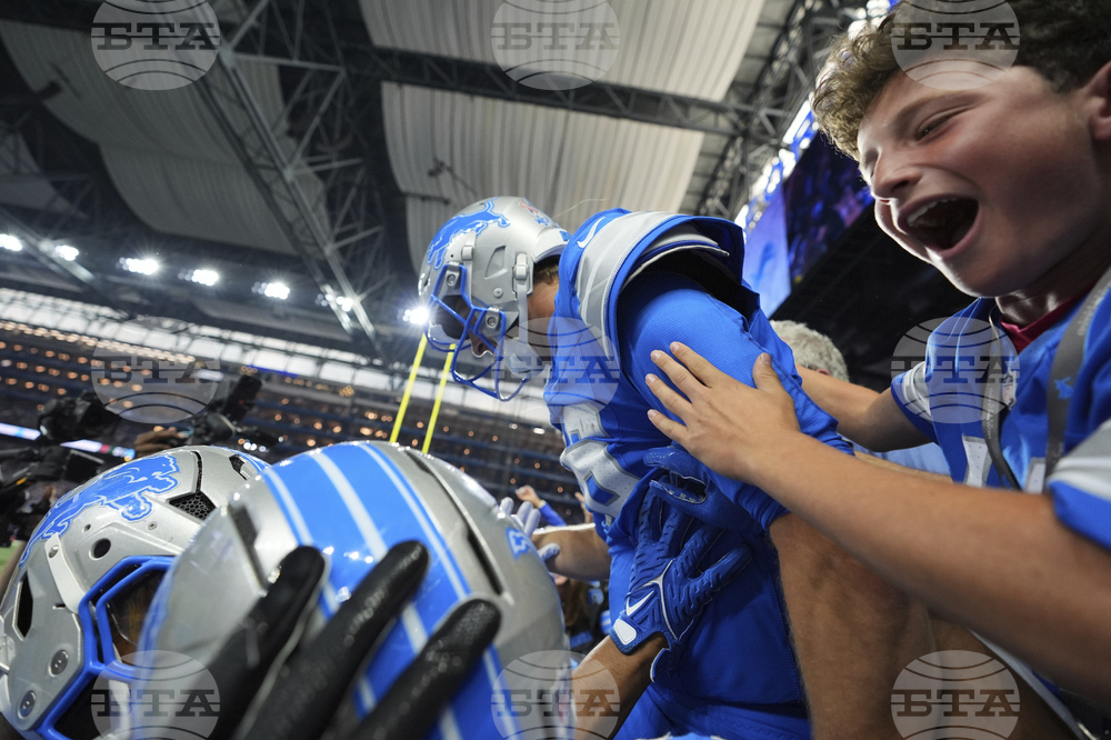 Fans cheer during the first half of an NFL football game between the Detroit Lions and the Chicago Bears in Detroit, Sunday, Sept. 14, 2025. (AP Photo/Ryan Sun)