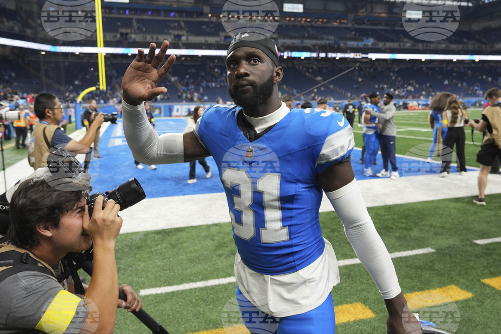 Detroit Lions safety Kerby Joseph (31) wait to take the field before an NFL football game against the Chicago Bears in Detroit, Sunday, Sept. 14, 2025. (AP Photo/Ryan Sun)