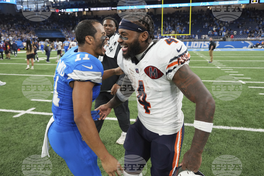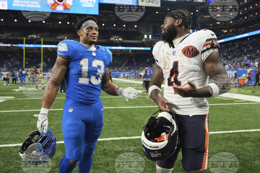 Detroit Lions running back Craig Reynolds (13) and Chicago Bears running back D'Andre Swift (4) talk as they leave the field following an NFL football game in Detroit, Sunday, Sept. 14, 2025. (AP Photo/Ryan Sun)