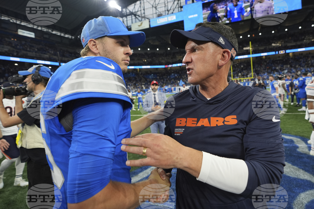Detroit Lions quarterback Jared Goff, left, talks with Chicago Bears defensive coordinator Dennis Allen, right, following their NFL football game in Detroit, Sunday, Sept. 14, 2025. (AP Photo/Ryan Sun)