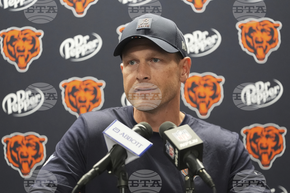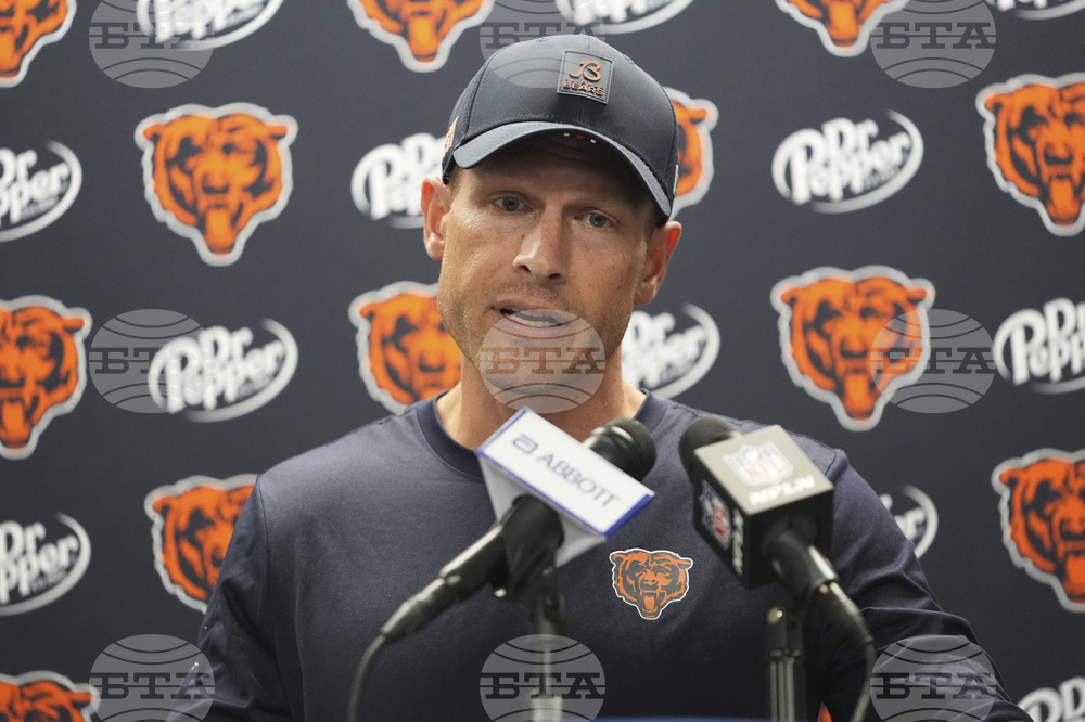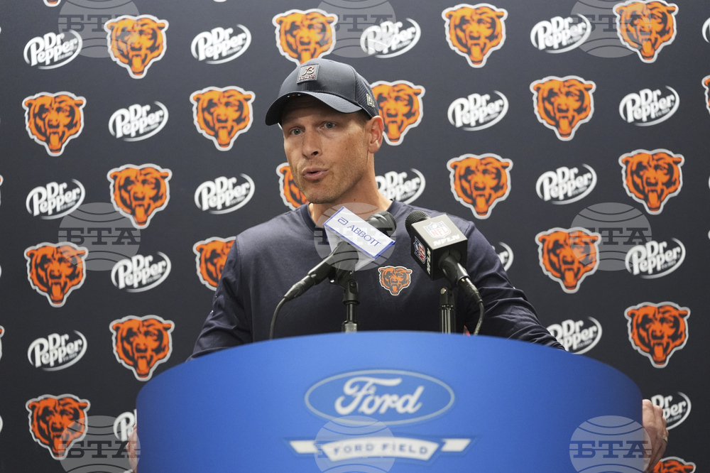 Chicago Bears head coach Ben Johnson talks to the media following an NFL football game against the Detroit Lions in Detroit, Sunday, Sept. 14, 2025. (AP Photo/Ryan Sun)