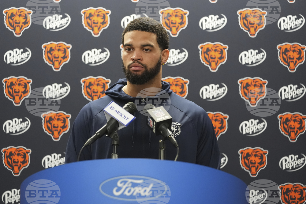 Chicago Bears quarterback Caleb Williams talks to the media following an NFL football game against the Detroit Lions in Detroit, Sunday, Sept. 14, 2025. (AP Photo/Ryan Sun)