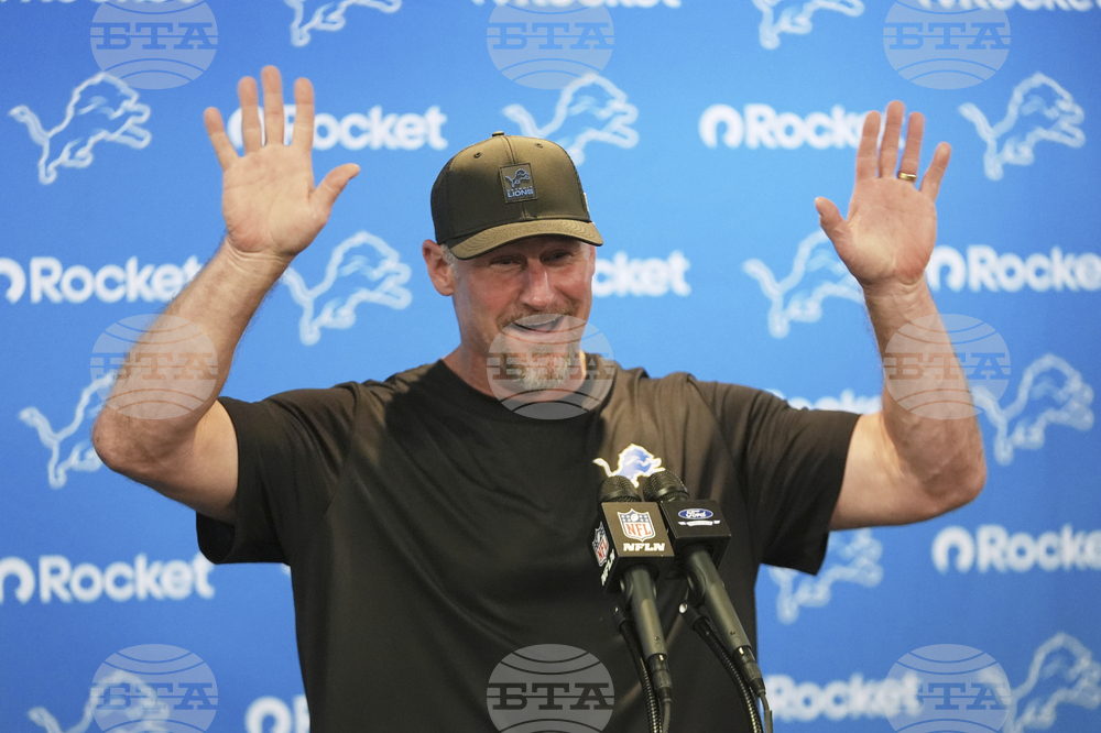 Detroit Lions head coach Dan Campbell talks to the media following an NFL football game against the Chicago Bears in Detroit, Sunday, Sept. 14, 2025. (AP Photo/Paul Sancya)