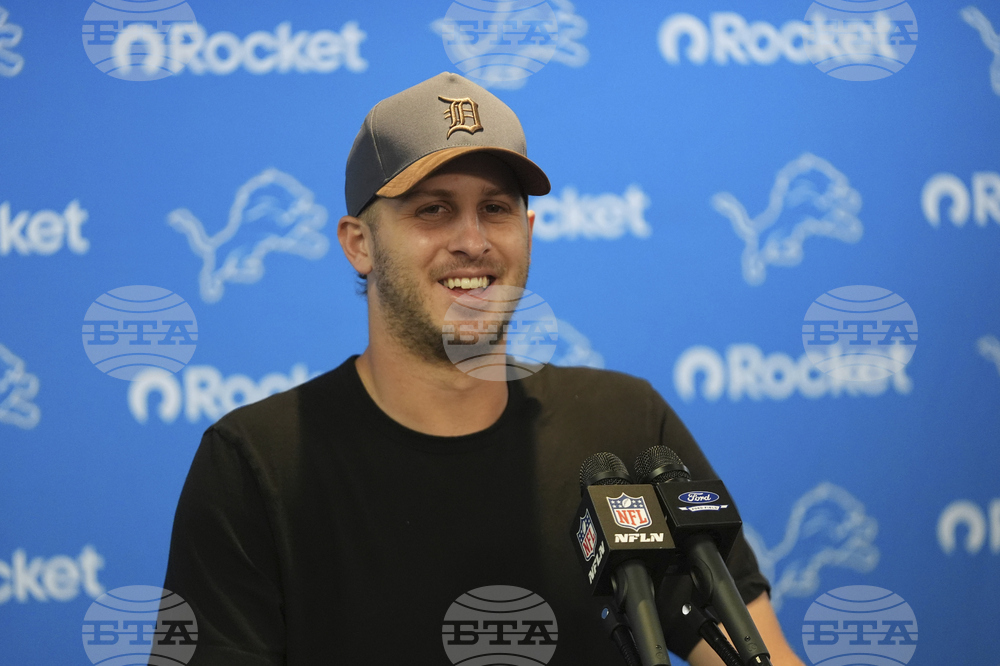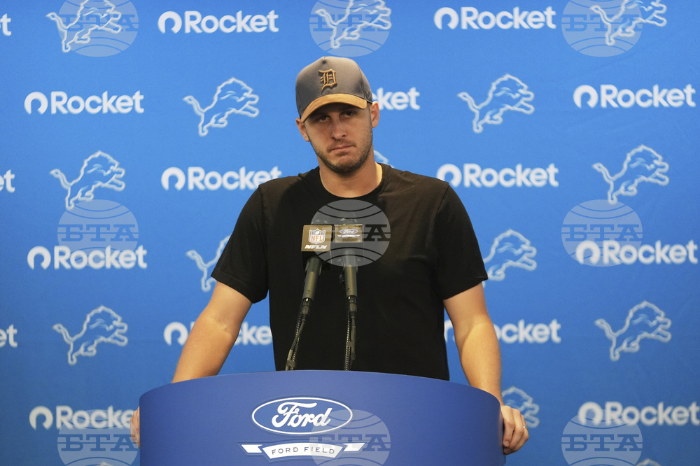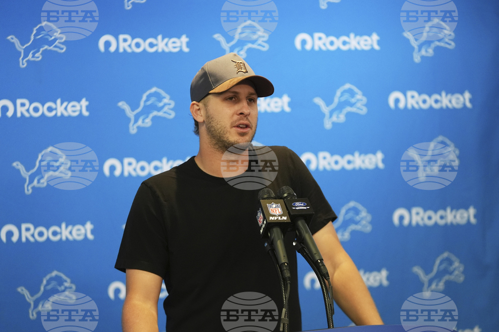Detroit Lions quarterback Jared Goff talks to the media following an NFL football game against the Chicago Bears in Detroit, Sunday, Sept. 14, 2025. (AP Photo/Paul Sancya)