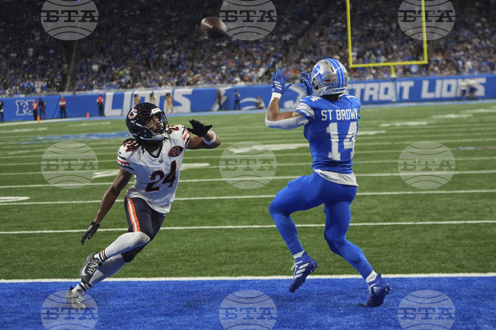 Detroit Lions wide receiver Amon-Ra St. Brown (14) makes a touchdown catch against the Chicago Bears during the second half of an NFL football game in Detroit, Sunday, Sept. 14, 2025. (AP Photo/Ryan Sun)