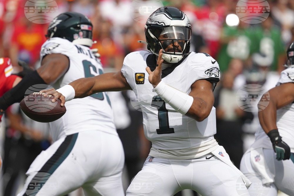 Philadelphia Eagles quarterback Jalen Hurts (1) throws during the second half of an NFL football game against the Kansas City Chiefs Sunday, Sept. 14, 2025, in Kansas City, Mo. (AP Photo/Ed Zurga)