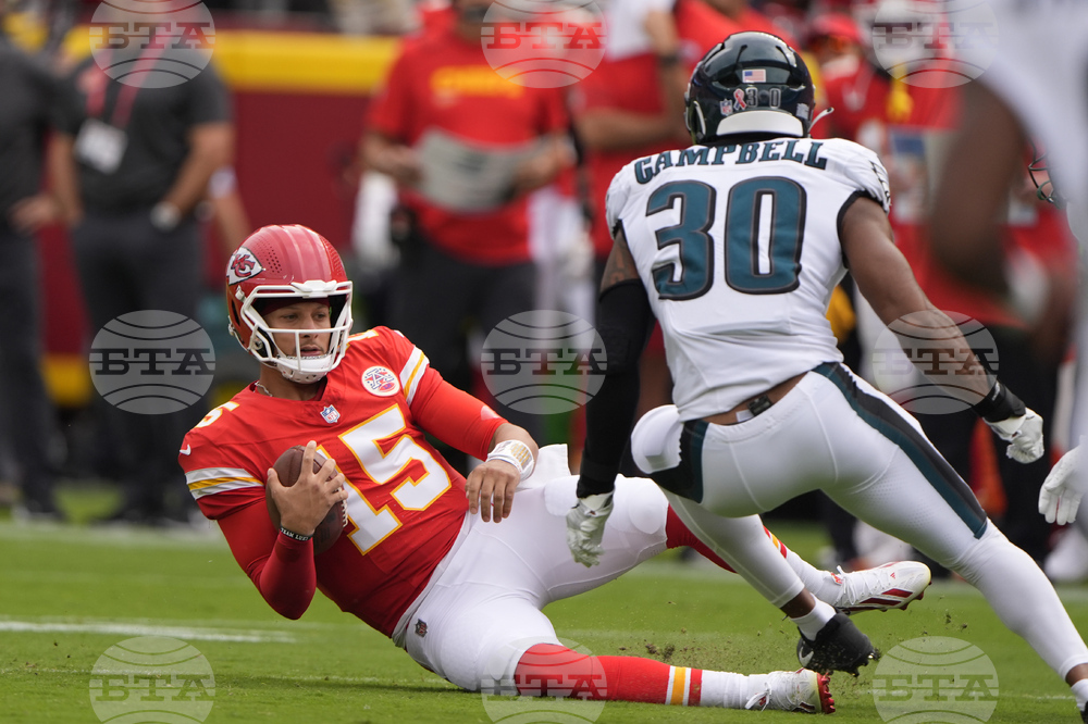 Kansas City Chiefs quarterback Patrick Mahomes (15) scrambles as Philadelphia Eagles linebacker Jihaad Campbell (30) defends during the first half of an NFL football game Sunday, Sept. 14, 2025, in Kansas City, Mo. (AP Photo/Charlie Riedel)