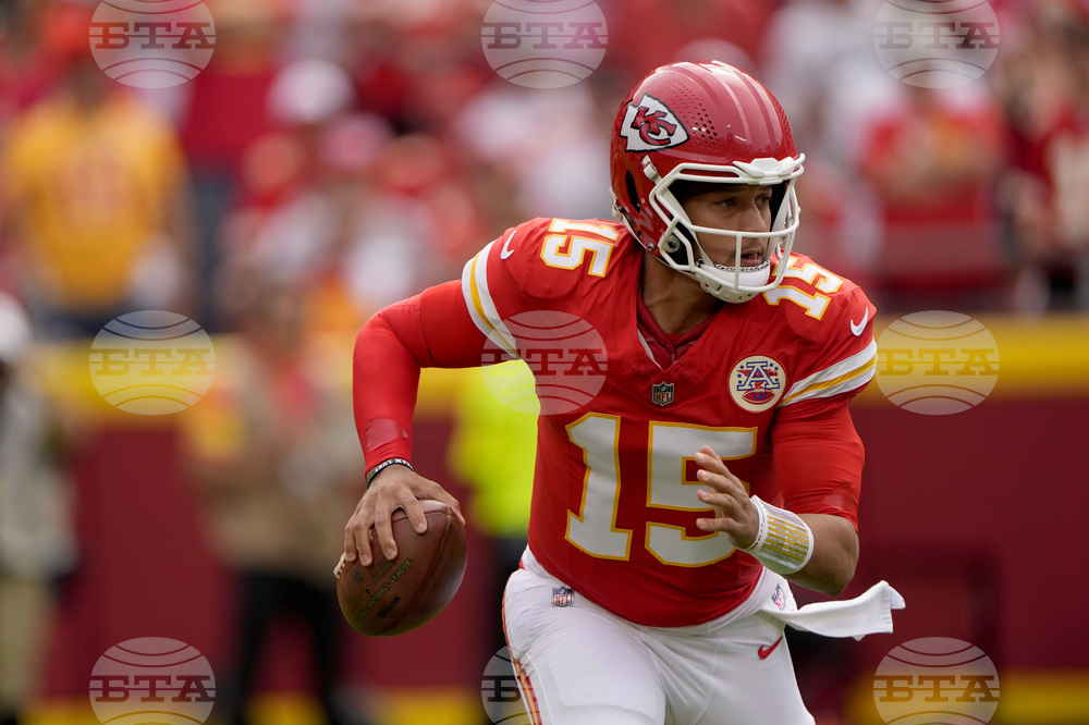 Kansas City Chiefs quarterback Patrick Mahomes (15) is introduced before an NFL football game against the Philadelphia Eagles Sunday, Sept. 14, 2025, in Kansas City, Mo. (AP Photo/Charlie Riedel)