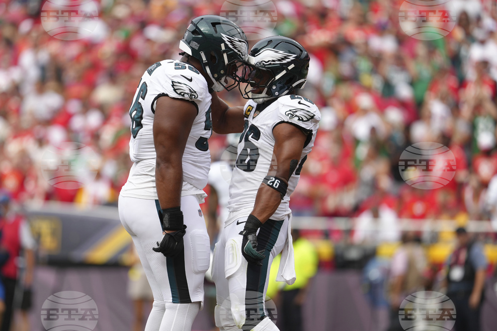Philadelphia Eagles quarterback Jalen Hurts (1) and running back Saquon Barkley celebrate as they walk off the field following a victory over the Kansas City Chiefs in an NFL football game Sunday, Sept. 14, 2025, in Kansas City, Mo. (AP Photo/Ed Zurga)