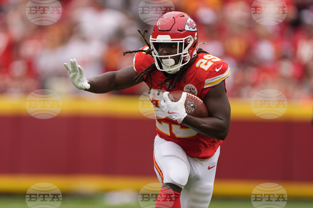 Kansas City Chiefs running back Kareem Hunt runs with the ball during the first half of an NFL football game against the Philadelphia Eagles Sunday, Sept. 14, 2025, in Kansas City, Mo. (AP Photo/Charlie Riedel)