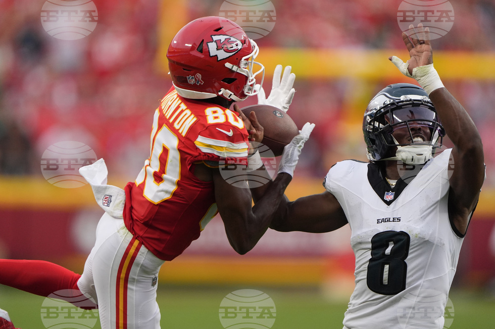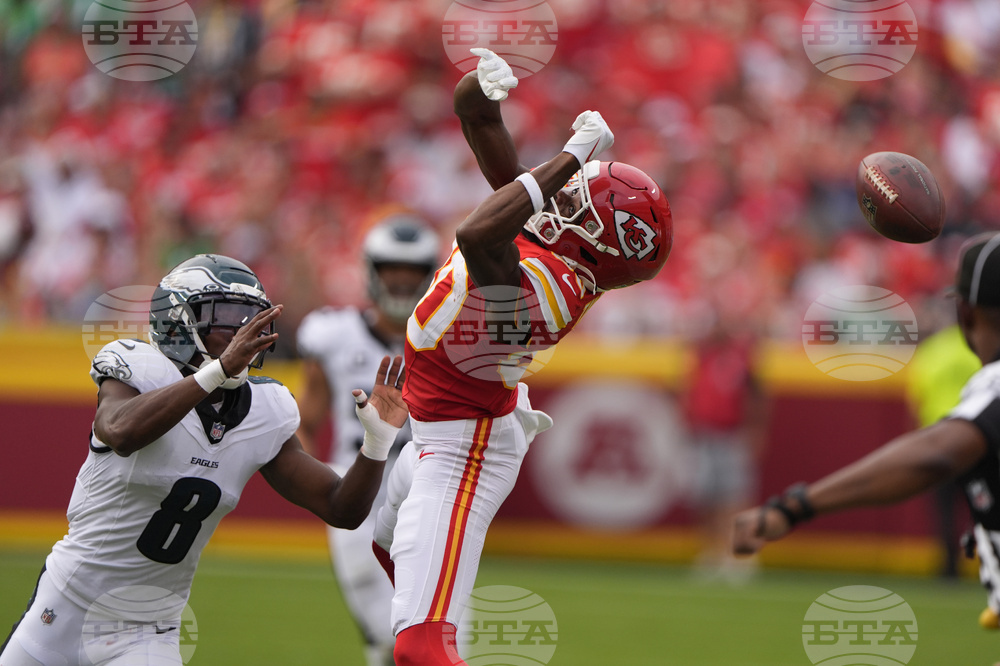Kansas City Chiefs wide receiver Tyquan Thornton, right, is unable to catch a pass as Philadelphia Eagles cornerback Adoree' Jackson (8) defends during the second half of an NFL football game Sunday, Sept. 14, 2025, in Kansas City, Mo. (AP Photo/Charlie Riedel)