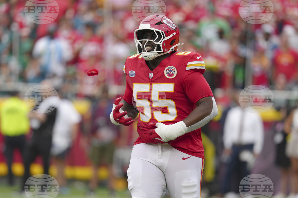 Kansas City Chiefs defensive tackle Omarr Norman-Lott celebrates after sacking Philadelphia Eagles quarterback Jalen Hurts during the second half of an NFL football game Sunday, Sept. 14, 2025, in Kansas City, Mo. (AP Photo/Ed Zurga)