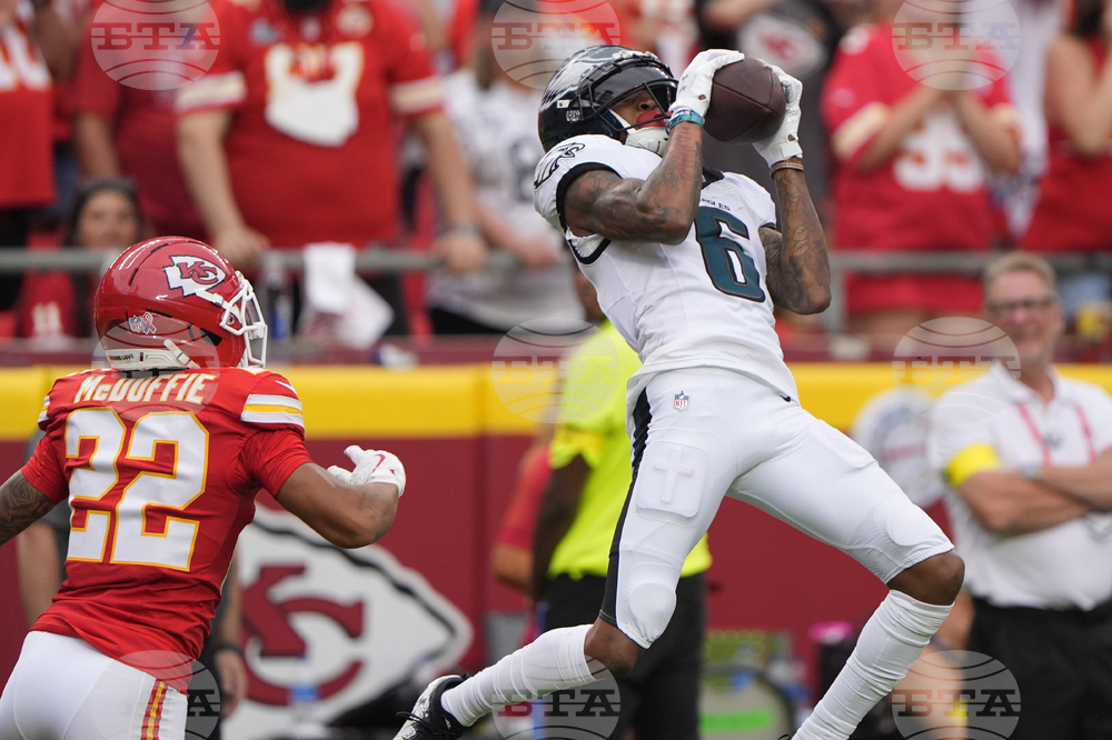 Philadelphia Eagles wide receiver DeVonta Smith (6) catches a pass as Kansas City Chiefs cornerback Trent McDuffie (22) defends during the second half of an NFL football game Sunday, Sept. 14, 2025, in Kansas City, Mo. (AP Photo/Charlie Riedel)