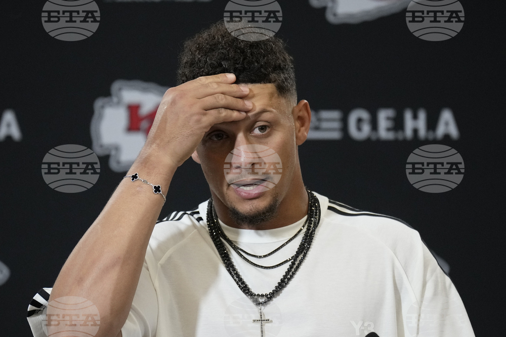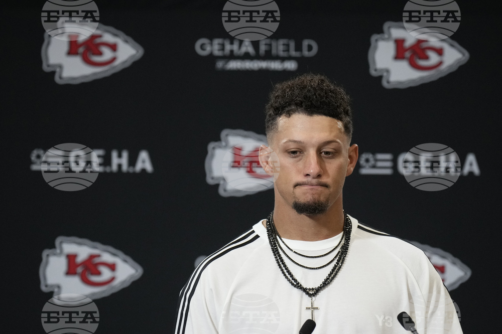 Kansas City Chiefs quarterback Patrick Mahomes speaks during a news conference following an NFL football game against the Philadelphia Eagles Sunday, Sept. 14, 2025, in Kansas City, Mo. (AP Photo/Charlie Riedel)