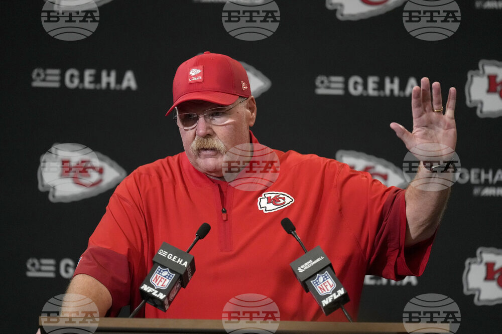 Kansas City Chiefs head coach Andy Reid speaks during a news conference following an NFL football game against the Philadelphia Eagles Sunday, Sept. 14, 2025, in Kansas City, Mo. (AP Photo/Charlie Riedel)