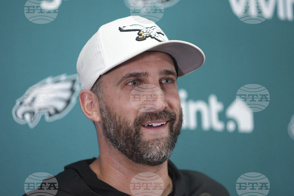 Philadelphia Eagles head coach Nick Sirianni speaks during a news conference following an NFL football game against the Kansas City Chiefs Sunday, Sept. 14, 2025, in Kansas City, Mo. (AP Photo/Ed Zurga)