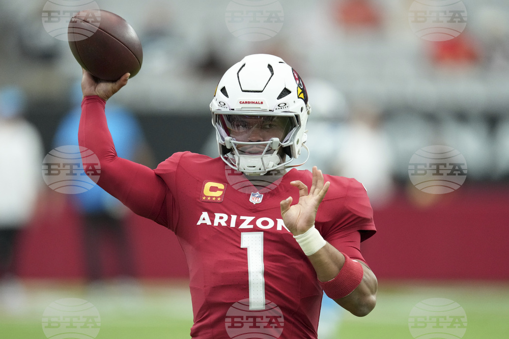 Arizona Cardinals quarterback Kyler Murray warms up prior to an NFL football game against the Carolina Panthers, Sunday, Sept. 14, 2025, in Glendale, Ariz. (AP Photo/Ross D. Franklin)