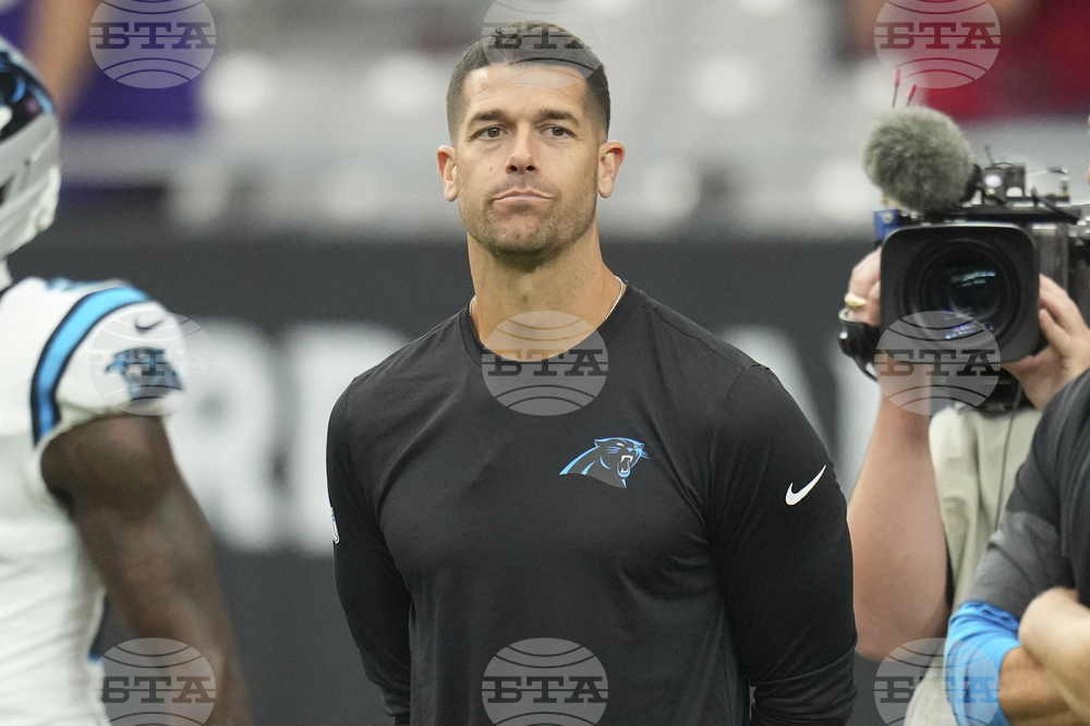 Carolina Panthers head coach Dave Canales watches warm ups prior to an NFL football game against the Arizona Cardinals, Sunday, Sept. 14, 2025, in Glendale, Ariz. (AP Photo/Rick Scuteri)