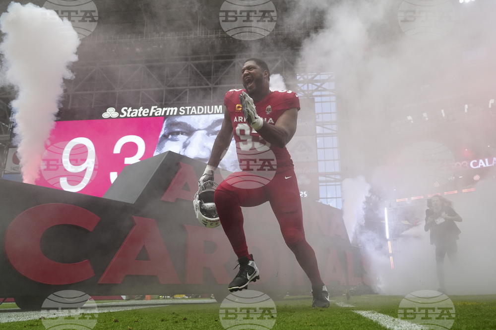 Arizona Cardinals defensive tackle Calais Campbell (93) takes the field prior to an NFL football game against the Carolina Panthers, Sunday, Sept. 14, 2025, in Glendale, Ariz. (AP Photo/Ross D. Franklin)