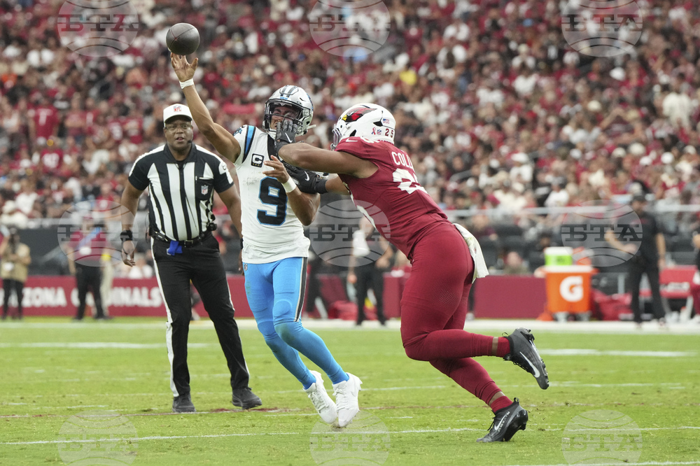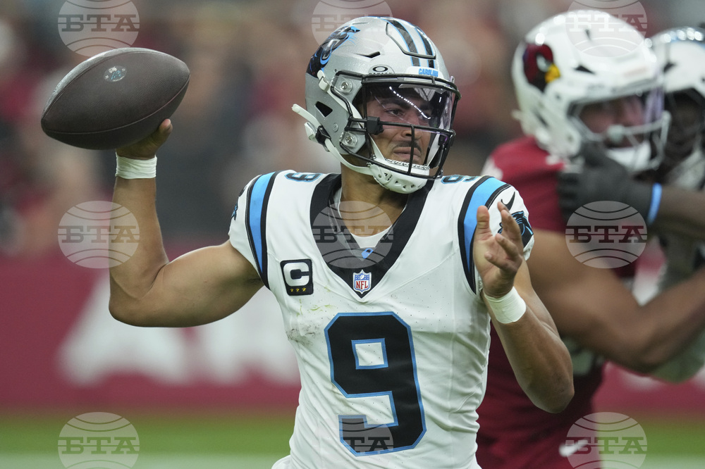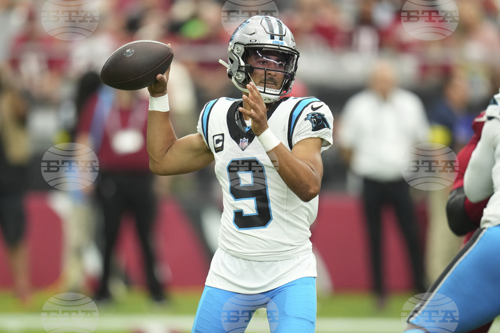 Carolina Panthers quarterback Bryce Young (9) throws against the Arizona Cardinals during the first half of an NFL football game, Sunday, Sept. 14, 2025, in Glendale, Ariz. (AP Photo/Ross D. Franklin)