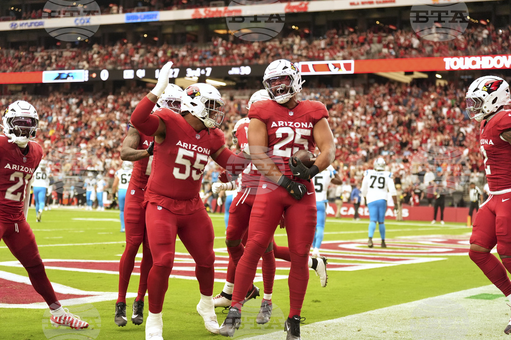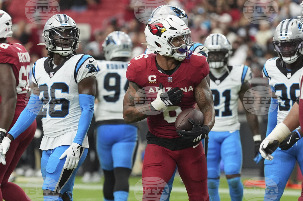 Arizona Cardinals running back Trey Benson (33) runs against the Carolina Panthers during the first half of an NFL football game, Sunday, Sept. 14, 2025, in Glendale, Ariz. (AP Photo/Rick Scuteri)