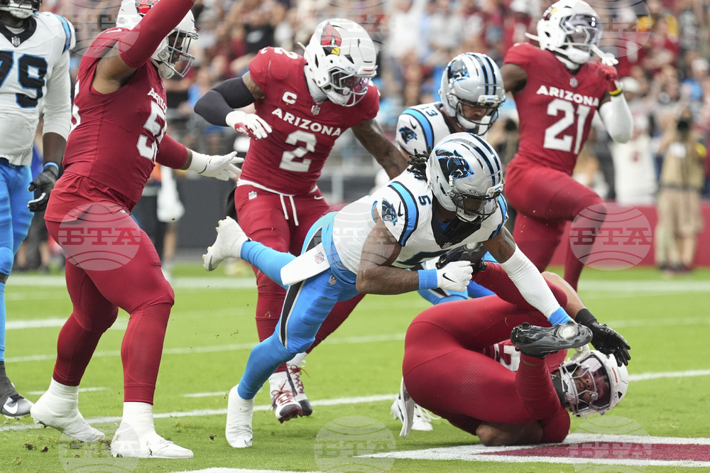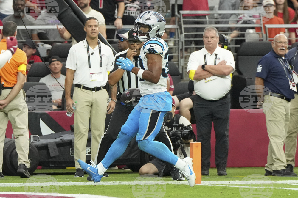 Carolina Panthers running back Chuba Hubbard scores a touchdown against the Arizona Cardinals during the second half of an NFL football game, Sunday, Sept. 14, 2025, in Glendale, Ariz. (AP Photo/Ross D. Franklin)