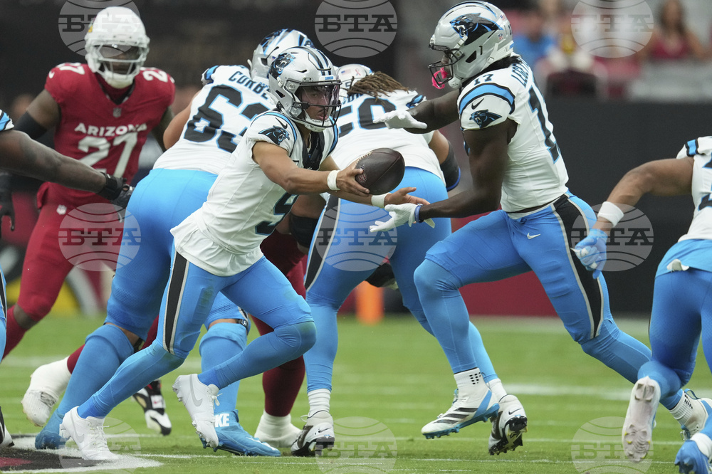 Carolina Panthers quarterback Bryce Young (9) and off to running back Xavier Legette (17) during the first half of an NFL football game against the Arizona Cardinals, Sunday, Sept. 14, 2025, in Glendale, Ariz. (AP Photo/Ross D. Franklin)