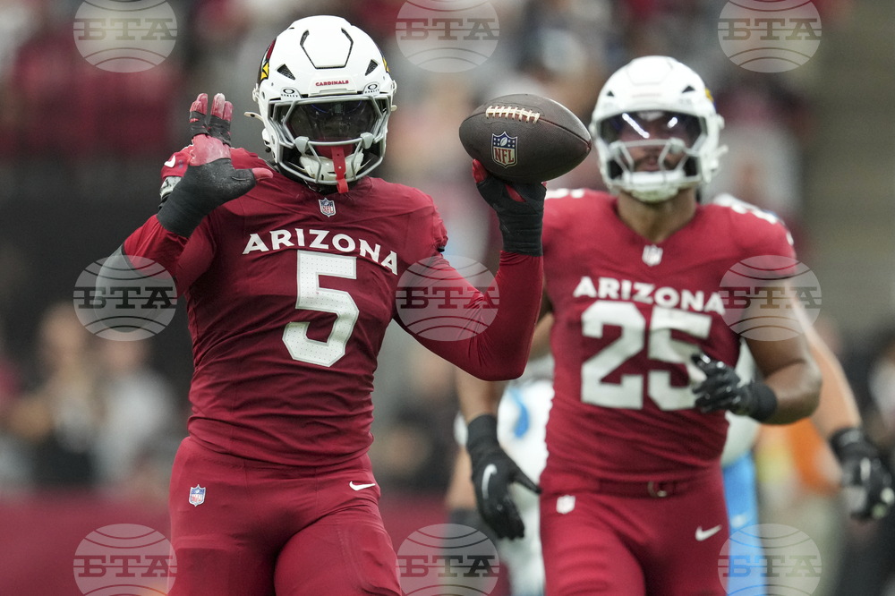 Arizona Cardinals linebacker Baron Browning (5) celebrates an interception against the Carolina Panthers during the first half of an NFL football game, Sunday, Sept. 14, 2025, in Glendale, Ariz. (AP Photo/Ross D. Franklin)