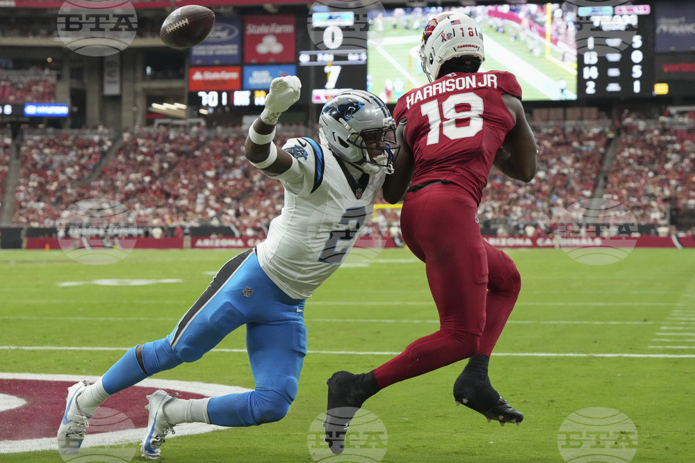 Carolina Panthers cornerback Mike Jackson (2) breaks up a pass intended for Arizona Cardinals wide receiver Marvin Harrison Jr. during the first half of an NFL football game, Sunday, Sept. 14, 2025, in Glendale, Ariz. (AP Photo/Ross D. Franklin)