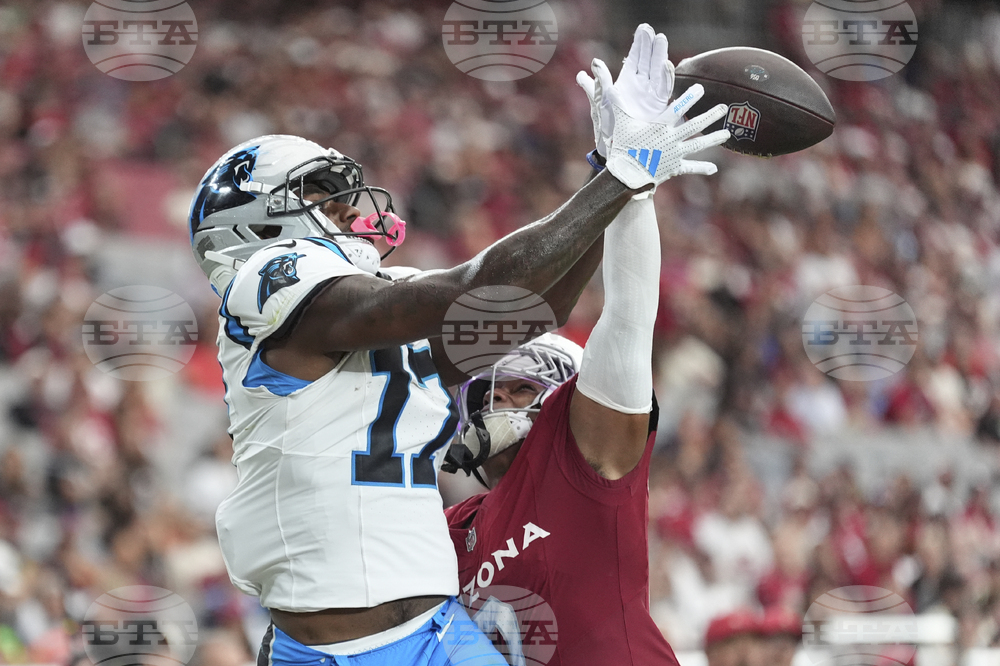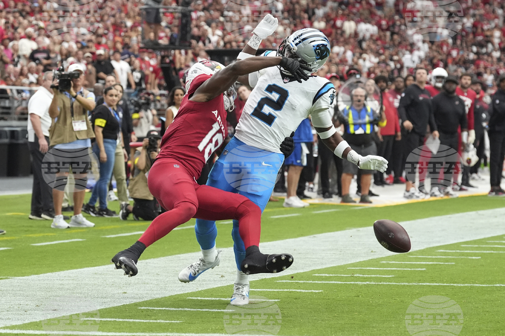 Carolina Panthers wide receiver Tetairoa McMillan (4) can't make the catch as Arizona Cardinals cornerback Denzel Burke defends during the second half of an NFL football game, Sunday, Sept. 14, 2025, in Glendale, Ariz. (AP Photo/Ross D. Franklin)