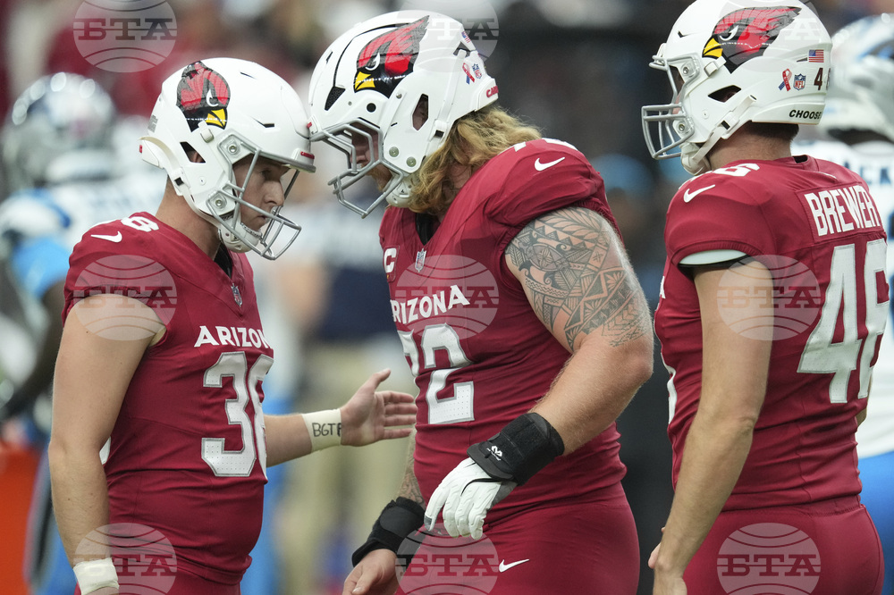 Carolina Panthers place kicker Ryan Fitzgerald kicks a field goal as punter Sam Martin (6) holds against the Arizona Cardinals during the first half of an NFL football game, Sunday, Sept. 14, 2025, in Glendale, Ariz. (AP Photo/Ross D. Franklin)