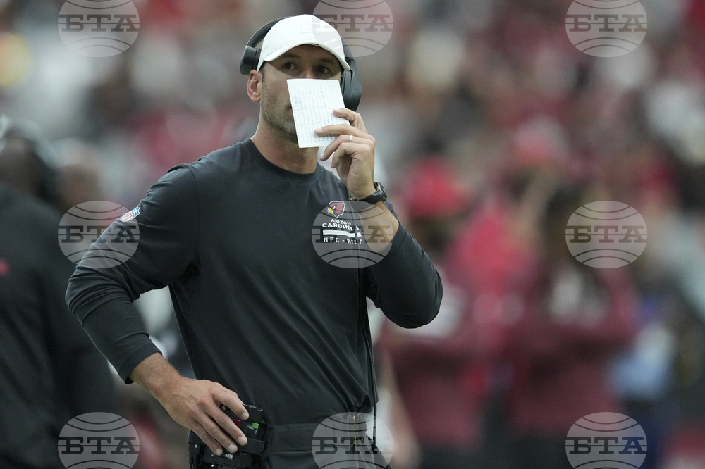 Arizona Cardinals head coach Jonathan Gannon watches warm ups prior to an NFL football game against the Carolina Panthers, Sunday, Sept. 14, 2025, in Glendale, Ariz. (AP Photo/Ross D. Franklin)