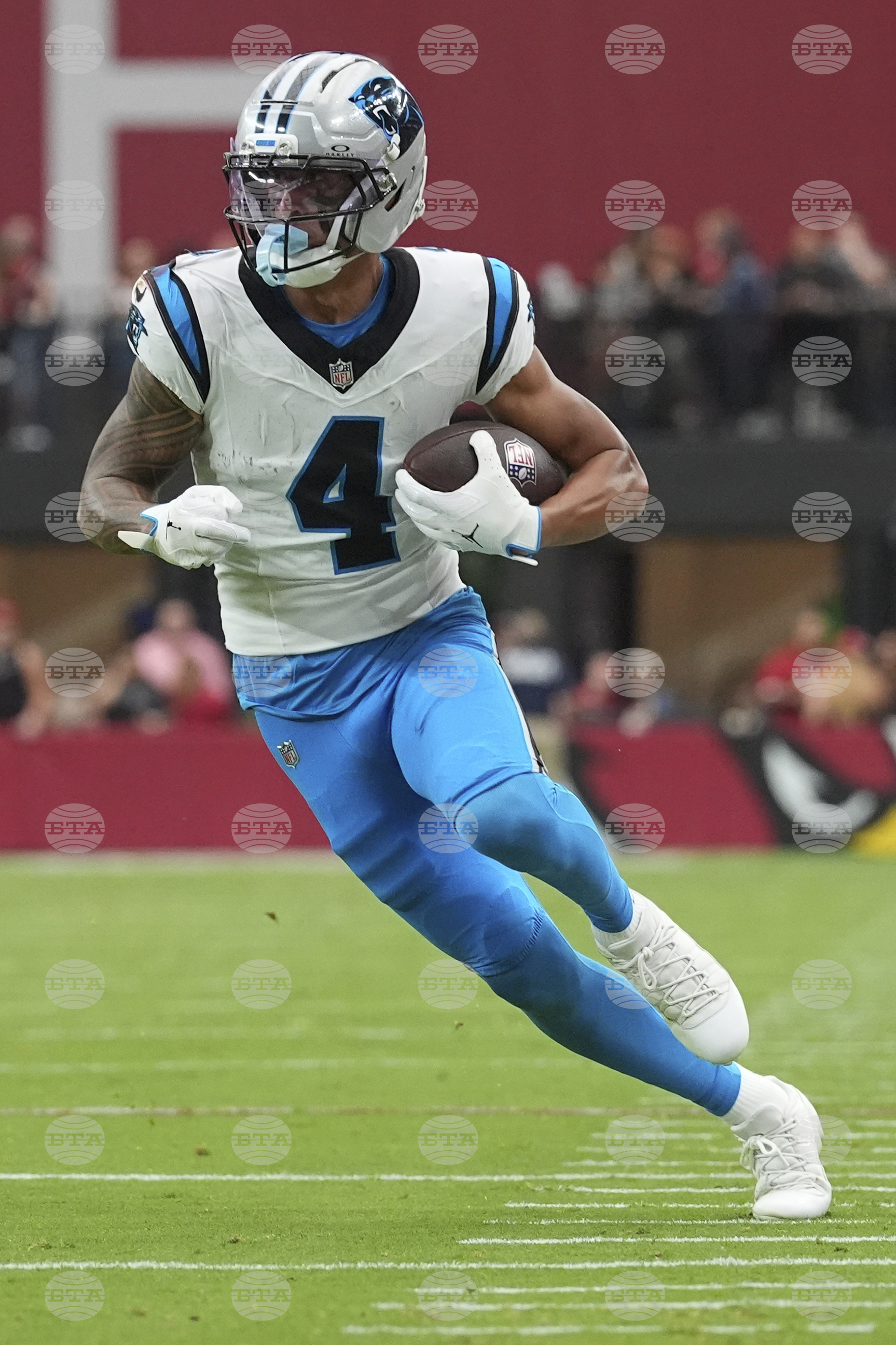 Carolina Panthers wide receiver Tetairoa McMillan (4) runs after the catch against the Arizona Cardinals during the first half of an NFL football game, Sunday, Sept. 14, 2025, in Glendale, Ariz. (AP Photo/Ross D. Franklin)