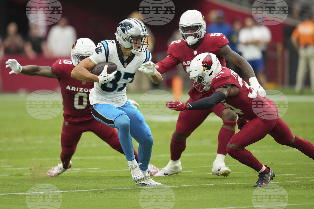 Carolina Panthers wide receiver Brycen Tremayne (87) tries to avoid the tackle of Arizona Cardinals safety Jalen Thompson, right, during the first half of an NFL football game, Sunday, Sept. 14, 2025, in Glendale, Ariz. (AP Photo/Rick Scuteri)