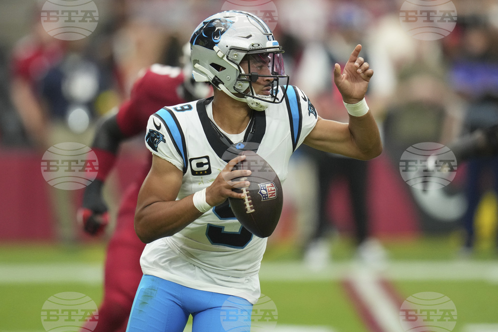 Carolina Panthers quarterback Bryce Young (9) look to throw against the Arizona Cardinals during the first half of an NFL football game, Sunday, Sept. 14, 2025, in Glendale, Ariz. (AP Photo/Rick Scuteri)