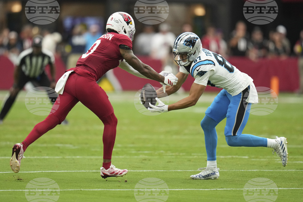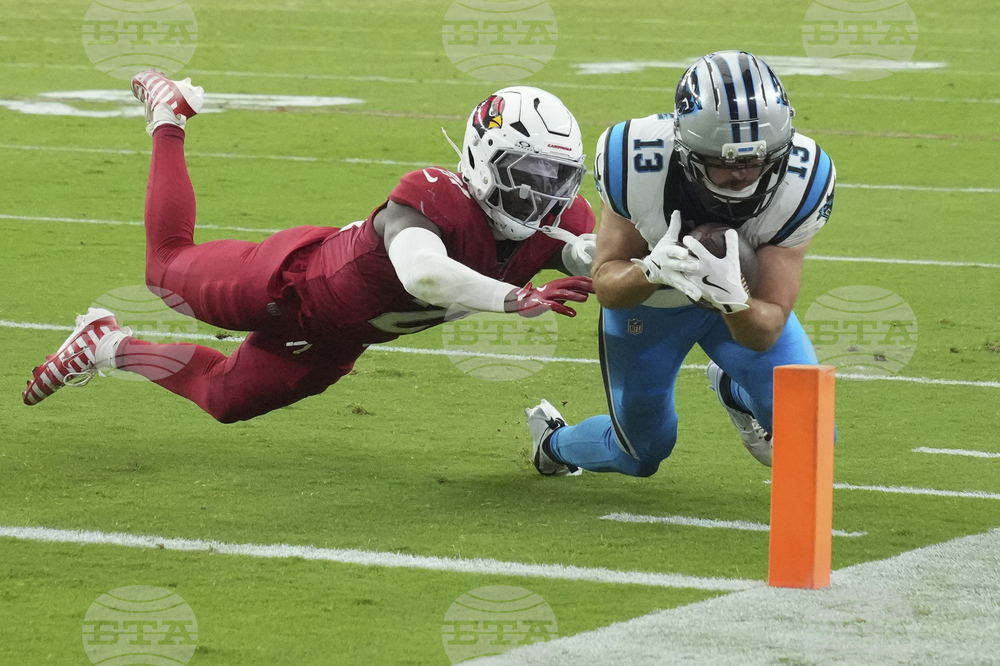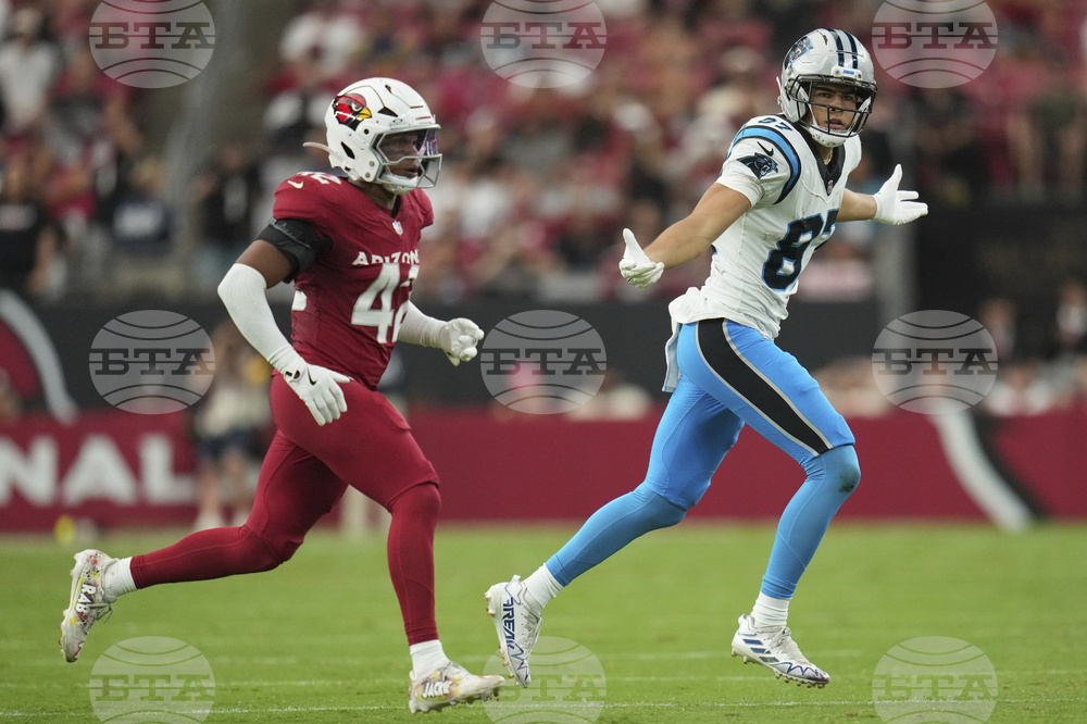 Carolina Panthers wide receiver Brycen Tremayne (87) looks for a call as Arizona Cardinals safety Dadrion Taylor-Demerson (42) looks on during the second half of an NFL football game, Sunday, Sept. 14, 2025, in Glendale, Ariz. (AP Photo/Rick Scuteri)