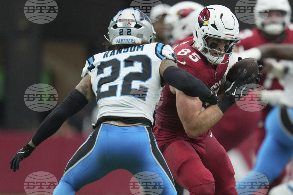 Arizona Cardinals tight end Trey McBride (85) tries to avoid Carolina Panthers safety Lathan Ransom (22) during the first half of an NFL football game, Sunday, Sept. 14, 2025, in Glendale, Ariz. (AP Photo/Ross D. Franklin)