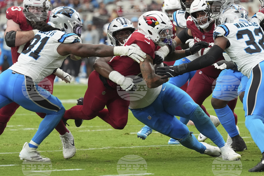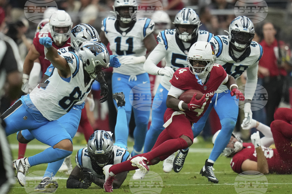 Arizona Cardinals running back Trey Benson eludes the reach of Carolina Panthers linebacker Christian Rozeboom during the first half of an NFL football game, Sunday, Sept. 14, 2025, in Glendale, Ariz. (AP Photo/Rick Scuteri)